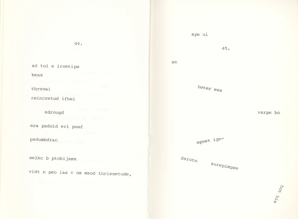 Whether or not one would have self-consciousness in a thought experiment vacuum, no line in a poem or poem in a book takes place in a vacuum, and the lines and pages of PCOET are in conversation with each other in much the same way that other, more familiar, poetic structures are. This page, for example, in its organisation, seems to suggest movements that I would associate with a particular style of minimalist lyric poetry: the first line is adapted, subtly, in the second line. An idea is vocalised in line 3 that is then rejected in line 8. The final line seems to move the poem into surprising, unexpected territory, and this is emphasised by the negation of line 8. There is, though, one notable absence if one does read these as what they might be taken to look like, i.e. lyric poems, and that is the organisational strategy of a discernible lyric voice or subject. There are examples of words that one might designate as pronouns in ones reading for their similarity to recognisable pronouns, e.g. “wei” (35), which it is tempting to read as a combination of the singular and plural forms of the first person, “I” (7), “i” (33), “u” (28), “ui” (45), which might combine first and second person, “Th.” (40), which could be an abbreviation of “they” or “thou”, and “1” (18), which registers as a combination between “one” and “I’, because of its visual similarity with the latter. However, this has to be balanced against the number of other floating letters that could, in PCOET, also be read as pronouns. This diffuseness and ambiguity around pronouns is part of the text’s anti-essential queerness. “ui” and “wei” queer the subject position, but so might “thoeisu” (1), “c” (6), “t” (7), “:” (8), “eyo” (9), if read pronominally.