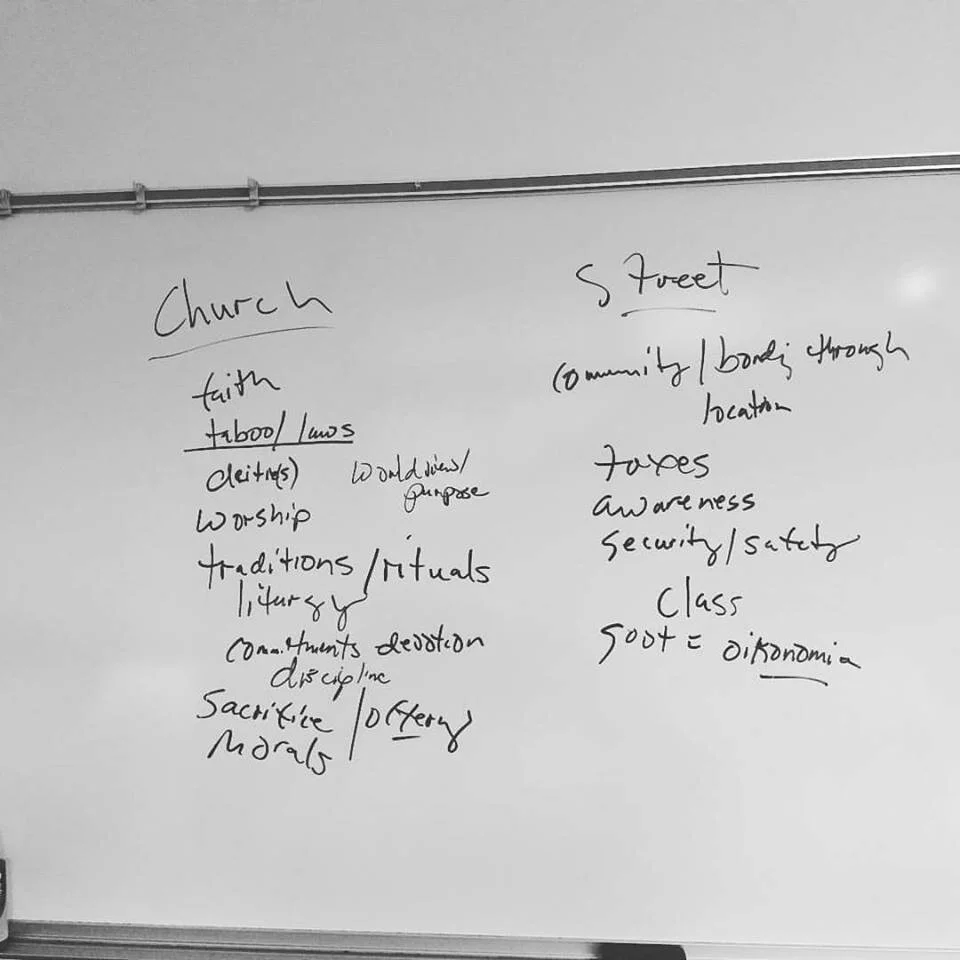 Without Ulmer’s specific direction, these students examined what these might be, and we began compiling these lists. In the “Church” pop-cycle, the students identified that through the “church,” we come to know taboos and laws, worldviews and purpose, traditions and rituals, and sacrifice or offering. In the “Street” pop-cycle, students identified that through the “street,” we come to know community and boundaries, rights and responsibilities to others, safety and security, socio-economic class, and government and its administration [Figure 7].